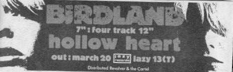 What's perhaps most interesting about Zodiac Motel is the speed at which transformed themselves into an entirely new entity - Birdland - by the summer of 1988. Robert and Lee are joined by Simon (Syd) Rodgers and Neil Hughes (variously referred to as Kale or Kyle in the press) on bass and drums respectively. Gone are the psychedelic gladrags, replaced by uniform of black and bleached hair. Birdland looked like a band. A London-based management company, Ronald Morris Associates (the home of Lazy Records), were soon interested and began paying some of the band's expenses by the July. In August the band recorded a two track demo, engineered and produced by Primitives soundman Paul Sampson. A handful of shows in London - which include a two song set at the neo-psych Alice In Wonderland Club in Soho - and another demo during the latter months of the year are enough to interest the press. Lazy secure the band a support slot on a nationwide tour with Jane's Addiction in January but they are dismissed after alleged mayhem following the first date in Manchester. Although the resultant column inches (both Sounds and Melody Maker are in attendance) are enough to bring about some much needed profile, already the band are hostage to a press corp intent on depicting them as cartoon punks or teenage tearaways. It was a tag they would increasingly come to resent. A debut EP for Lazy, 'Hollow Heart' is an adrenaline rush through the heart of Madchester and becomes an immediate classic. Swathed in Jesus & Mary Chain feedback, the decision to segue the first three tracks into a medley, replicating the rush of the live show was one of the great decisions in rock'n'roll. If Birdland had never made another record, this would be enough to justify their place in the annals of history. Panned by the judges on TV panel show 'Jukebox Jury', the audience vote it a hit and it climbs the independent charts, knocking the Pixies' 'Monkey Gone To Heaven' from the number one position. Sounds were moved enough to suggest that: "...as